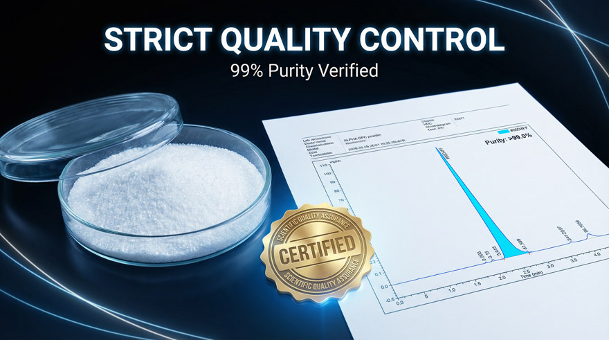 Our Alpha GPC powder is engineered for High Flowability, solving the common industry pain point of clumping. This ensures Easy Filling for capsules and seamless integration into powdered blends, reducing manufacturing waste and optimizing your production line’s efficiency and output quality.