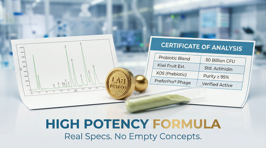 Stand out in the crowded gut-health market with our Doctoral R&D formula. Unlike standard supplements, Biotic-Cleanse utilizes PreforPro® (Phage) technology (LH01/LL5/T4D/LL12) to actively clear pathogens within hours. Combined with 50 Billion CFU of high-stability strains, your brand will offer a “Blue Ocean” solution that provides faster, more noticeable relief from bloating and indigestion.