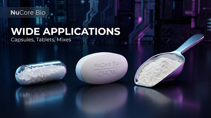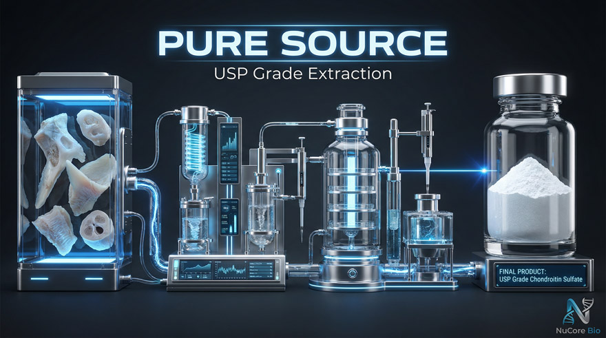 NuCore Bio’s USP-Grade Chondroitin Sulfate is a vital structural component of cartilage, scientifically proven to support joint mobility and bone density. By stimulating connective tissue synthesis and inhibiting degradative enzymes, it effectively cushions joints and promotes long-term flexibility. This high-purity bioactive material is essential for premium joint recovery protocols and daily mobility-support formulations.