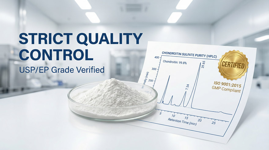 Guarantee your brand’s efficacy with our Lab-Tested 90% Purity Chondroitin Sulfate. Sourced from premium marine and bovine cartilage, our material adheres to strict USP Grade standards. Every batch is HPLC-verified for molecular weight and active content, ensuring your supplements meet the highest global quality benchmarks.