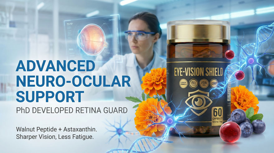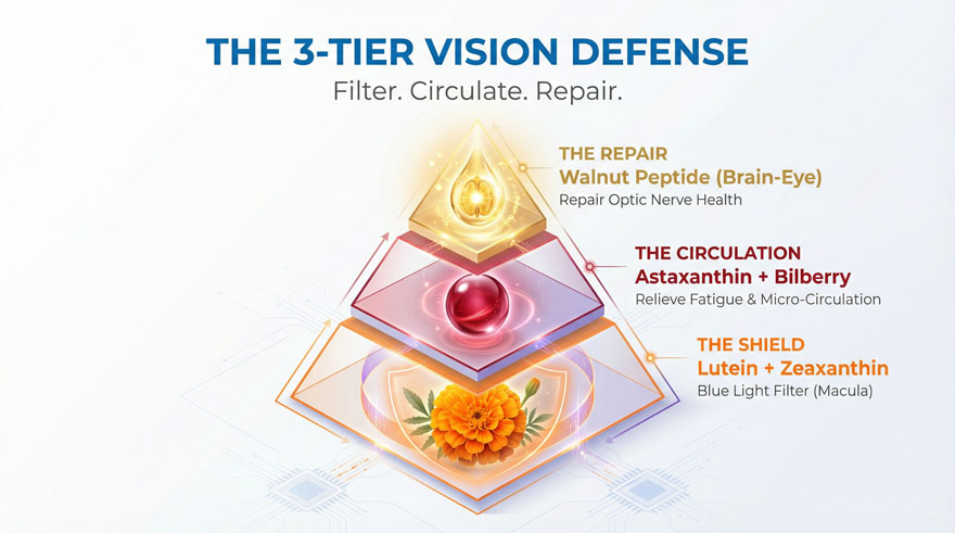 EYE-VISION SHIELD PRO delivers advanced ocular protection by combining Walnut Peptides with a high-potency antioxidant blend. It effectively filters harmful blue light, alleviates digital eye strain, and restores HD visual clarity. The 300-500 Dalton peptides ensure rapid neural and vascular repair in the eye area, while Lutein and Astaxanthin provide a “biological shield” against age-related macular degeneration and oxidative stress.