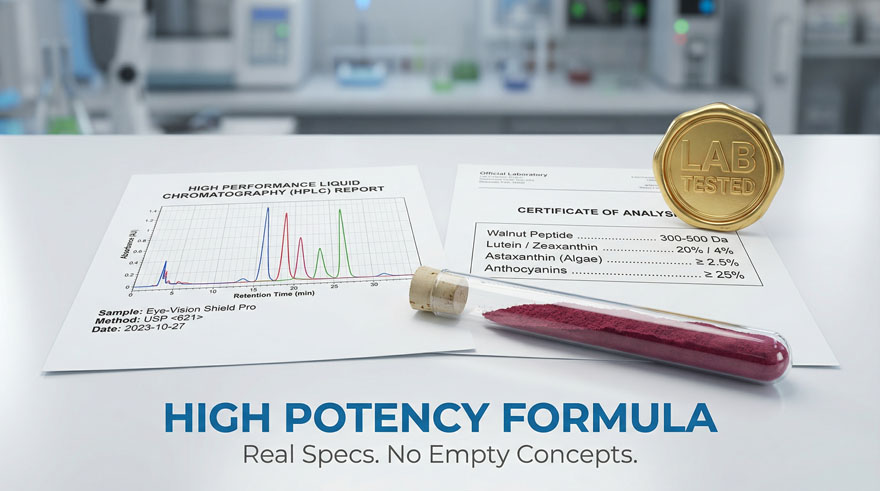 We provide transparency that procurement officers demand. Each batch contains 20% Lutein / 4% Zeaxanthin, $\ge 2.5\%$ Astaxanthin, and $\ge 25\%$ Anthocyanins. Enhanced with BioPerine for 30% higher nutrient uptake, this is a high-profit, high-efficacy formula built for repeat orders.