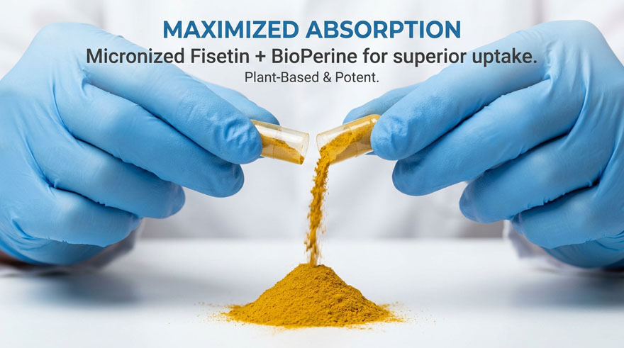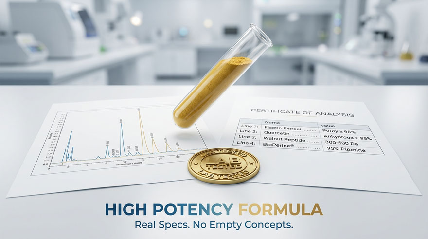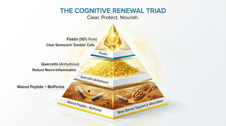 Our Neuro-Senolytic formula combines 98% Purity Fisetin, 95% Quercetin, and 300-500Da Small Molecule Walnut Peptides. Enhanced with BioPerine® for maximum bioavailability, we offer a “Blue Ocean” formula that moves beyond empty concepts to deliver verifiable biological activity and rapid consumer-perceived results.