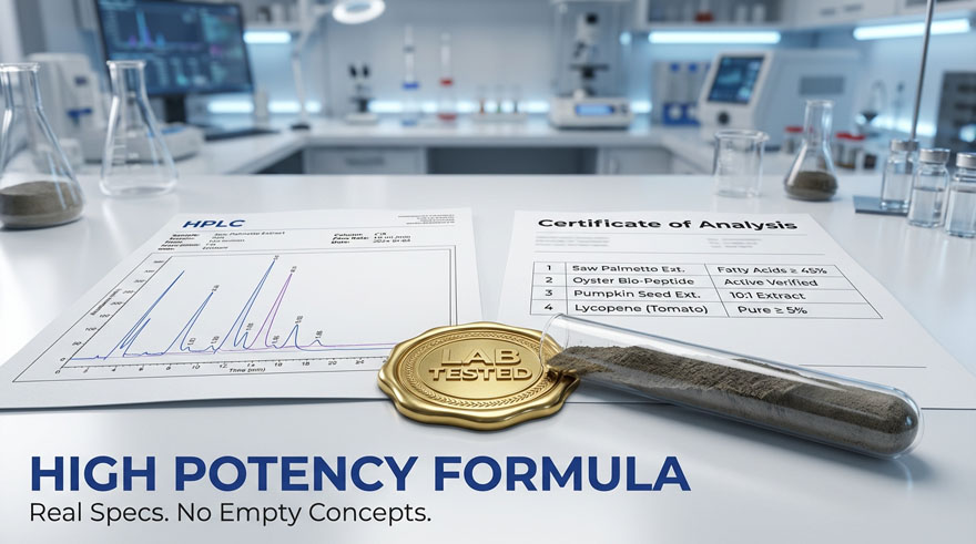 Developed by a global R&D center with 13 PhDs and 26 Masters, our Prosta-Vigor Peptide utilizes exclusive Huayan Bio-Peptide technology. We provide real HPLC-tested specifications, including Saw Palmetto (Fatty Acids ≥ 45%) and Tomato Extract (Lycopene ≥ 5%), ensuring your brand delivers clinical-strength results that build long-term consumer trust and high repurchase rates.
