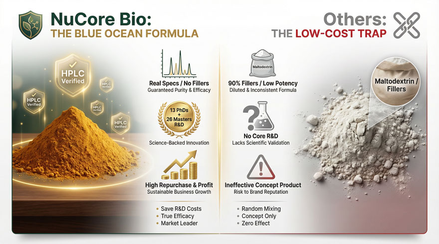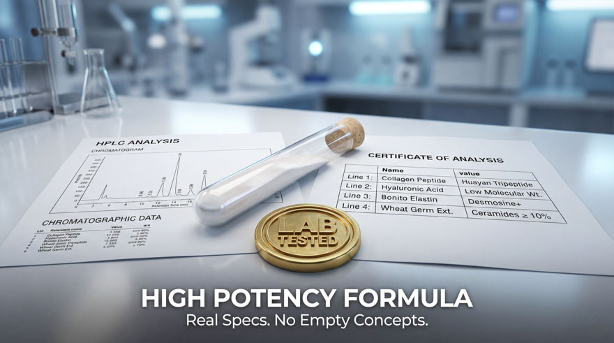 Stop competing on price and start winning on efficacy. Our formulas are developed by a Global R&D Center featuring 13 PhDs and 26 Masters. We replace “empty concepts” with real specs: HPLC-verified Collagen Tripeptides and Desmosine-rich Elastin. By offering a unique Blue Ocean Formula with zero R&D cost to you, we help your brand dominate the premium nutricosmetics market.