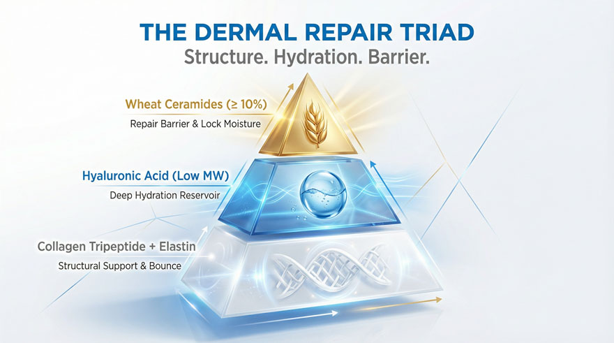 Engineered for a “Glass Skin” effect, this formula synergizes Huayan Fish Collagen Tripeptide with low molecular weight Sodium Hyaluronate to rebuild the dermal scaffold and boost internal hydration levels. Infused with Wheat Germ Extract (≥10% Ceramides) and Bonito Elastin, it actively repairs the skin barrier, reduces deep wrinkles, and restores youthful elasticity. Enhanced with BioPerine® for maximum nutrient bioavailability, it delivers visible radiance from within.