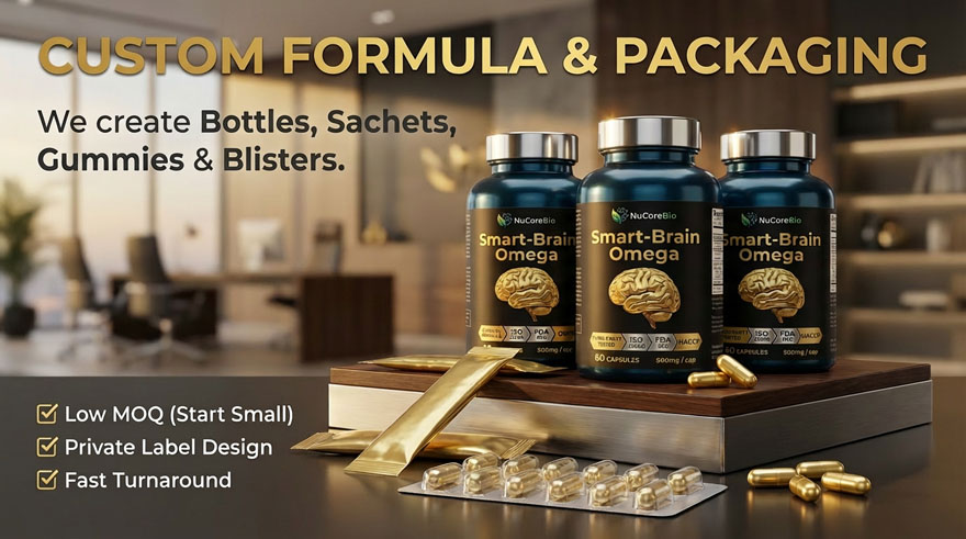 Boost your brand with our Doctoral R&D Formula, featuring a high-potency blend of Walnut Peptide (Huayan Bio-Peptide) and Phosphatidylserine (PS). We provide a One-Stop OEM Solution, transforming premium raw materials into market-ready finished capsules with zero R&D cost for you.