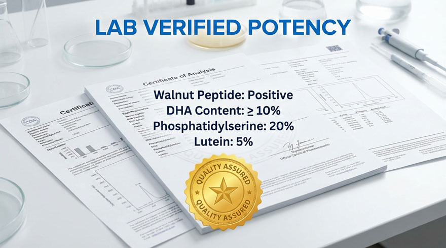 Stay ahead in the blue ocean market with “Real Specs, No Empty Concepts.” Our Certificate of Analysis (COA) guarantees DHA ≥ 10% and Lutein 5% purity. Each batch undergoes rigorous Third-Party Testing in our Global R&D Center to ensure maximum bioavailability and safety.
