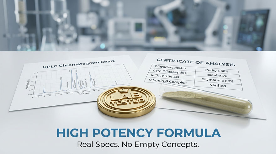 Your customers demand transparency. Our Lab Tested capsules contain real, high-spec ingredients: Silymarin ≥ 80% from Milk Thistle and BioPerine® for 30% higher bioavailability. We provide full HPLC purity reports, ensuring your brand is built on clinical-grade quality and trust.