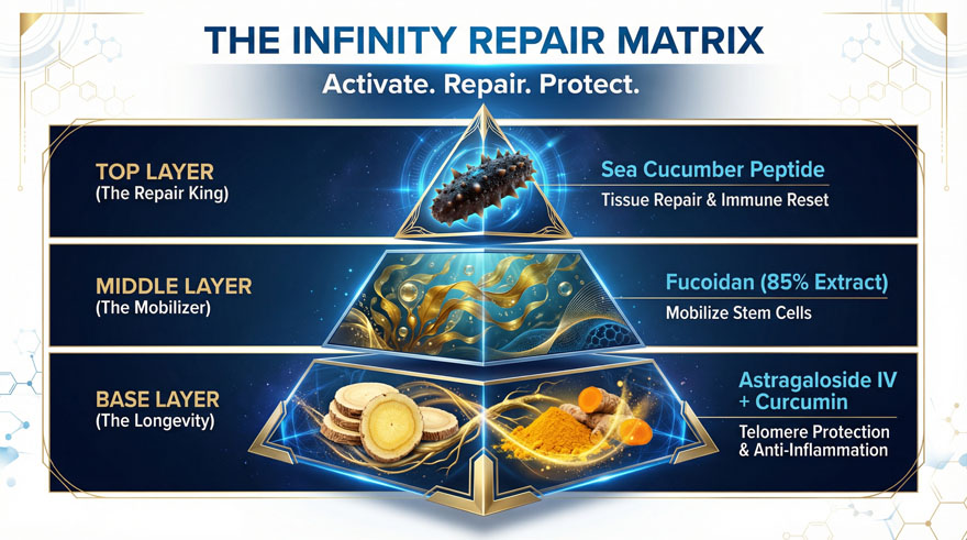 Advanced Cellular Vitality & Immune Support: Engineered with high-purity Sea Cucumber Peptides and Fucoidan Extract, this formula triggers deep cellular repair and regenerates dormant stem cells. It significantly bolsters immune defense, combats age-related physical decline, and promotes holistic longevity by optimizing metabolic pathways and reducing systemic inflammation.