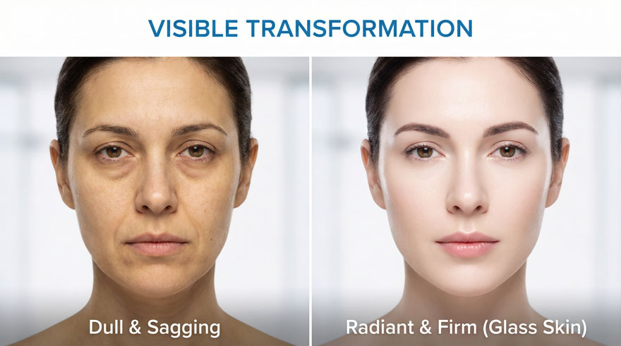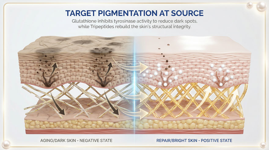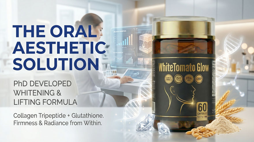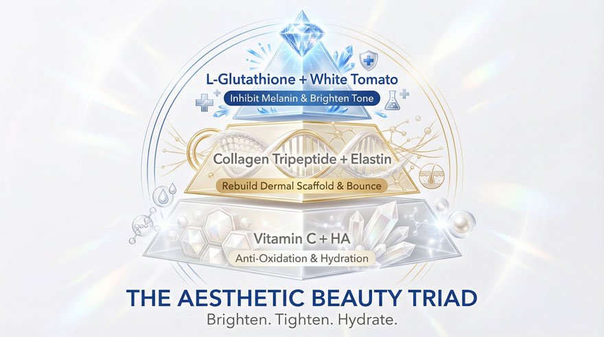 This doctoral-level R&D formula delivers Total Brightening by inhibiting melanin production and neutralizing free radicals. The synergistic blend of White Tomato Extract (Phytoene/Phytofluene) and Reduced L-Glutathione visibly fades dark spots and hyperpigmentation, while Collagen Tripeptide (CTP) and Bonito Elastin restore skin elasticity and smooth fine lines for a youthful, radiant complexion from within.