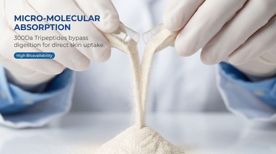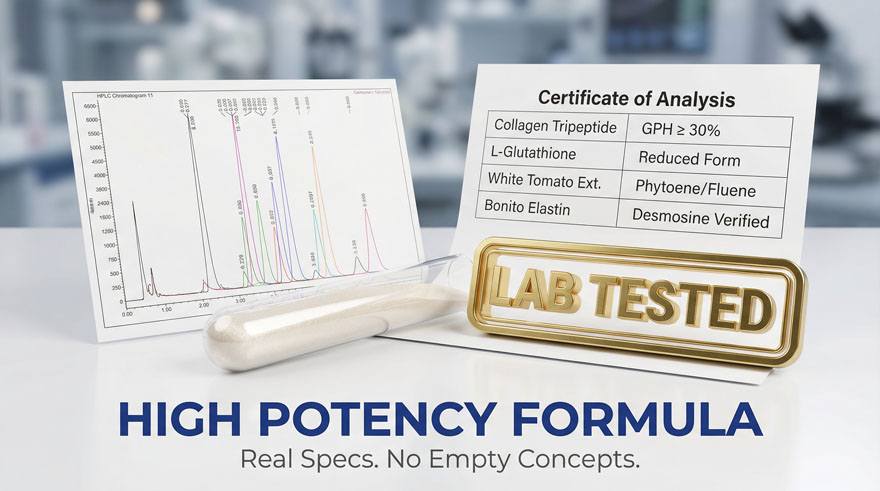 Leverage high-purity Collagen Tripeptide ($\ge$ 30%) and Bonito Elastin (Desmosine Verified). Our R&D center, backed by 13 PhD experts, ensures high-potency bioavailability that outperforms standard concept supplements, providing your brand with a High-Profit Blue Ocean competitive edge in the nutratech market.